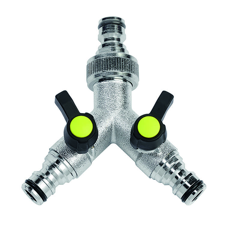 Verchromter 2-Wege-Verteiler mit Standardanschluss für Schnellkupplungen an aller Ein- und Ausgängen. Beide Ausgänge sind stufenlos regulierbar und vollständig absperrbar. • mit einer 1/2" oder 3/4" Schnellverbindung an allen Ein- und Ausgängen (Standardanschluss für Schnellkupplungen) •...