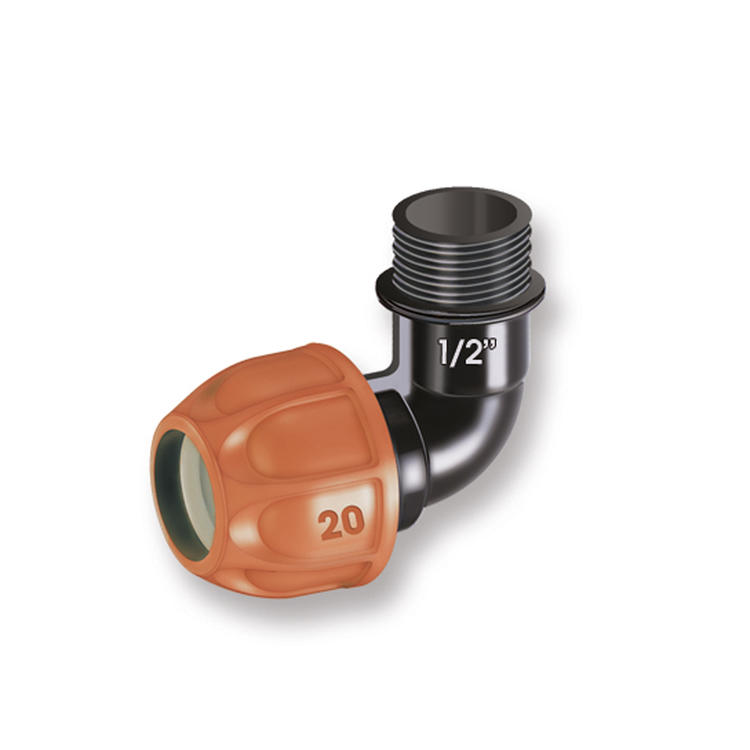 Klemmverbinder mit 90° Winkel und 1/2" Außengewinde, zur schnellen und sicheren Verschraubung ohne Werkzeug der Versenkregner Colibri, Turbo-Jet oder Pop-up Serie. • Winkel-Klemmverbinder 1/2" (20 mm) mit 1/2" Außengewinde, zur schnellen und sicheren Verschraubung ohne Werkzeuge