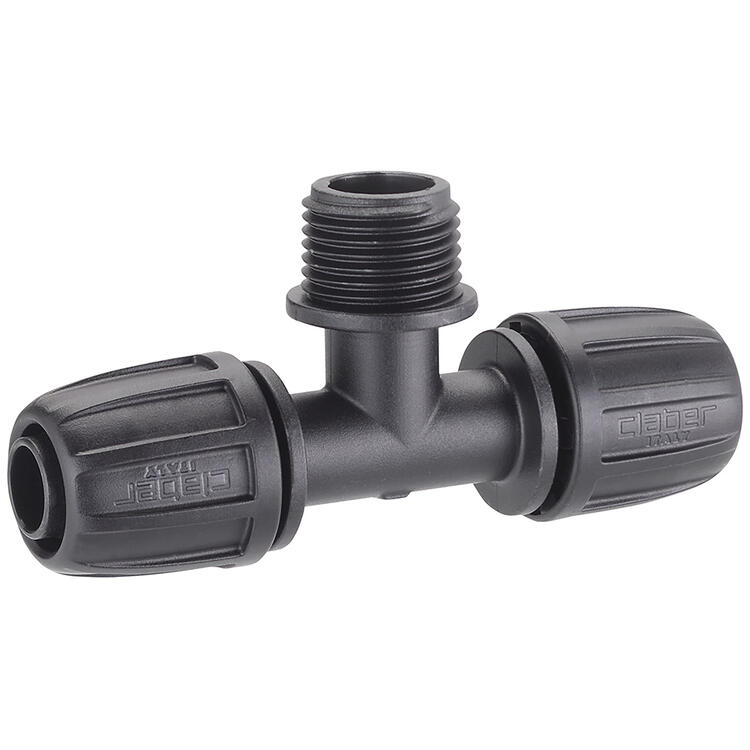 T-Stück Klemmverbinder zum Anschluss in Reihe der Versenkregner Colibrì ein Verlegerohr 1/2" (13 - 16 mm). • T-Stück aus PP für den Anschluss von Versenkregner an ein Verteilerrohr • 2x Klemmverbindung 1/2", 1x 1/2" Außengewinde